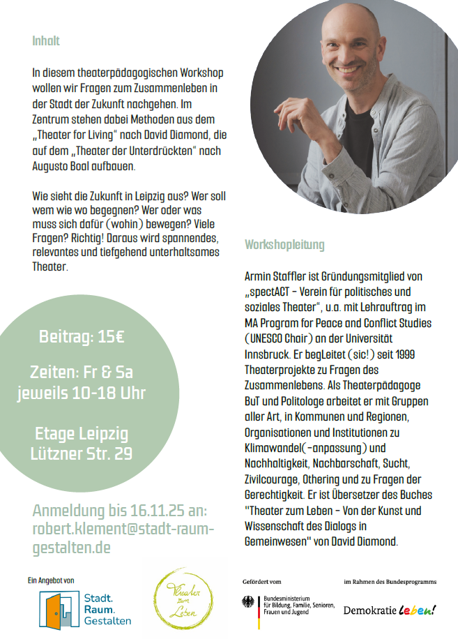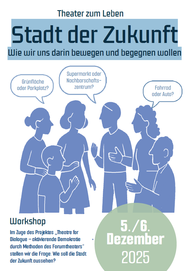 Im Rahmen von Theatre for Dialogue bieten wir einen theaterpädagogischen Workshop zum Thema „Stadt der Zukunft – Wie wir uns darin bewegen und begegnen wollen“ an. Armin Staffler, der den Workshop leitet, wird euch Methoden des Forumtheaters und des Theater for Living näher bringen, während Ihr euch mit den Fragen nach der Stadt der Zukunft auseinandersetzen könnt.